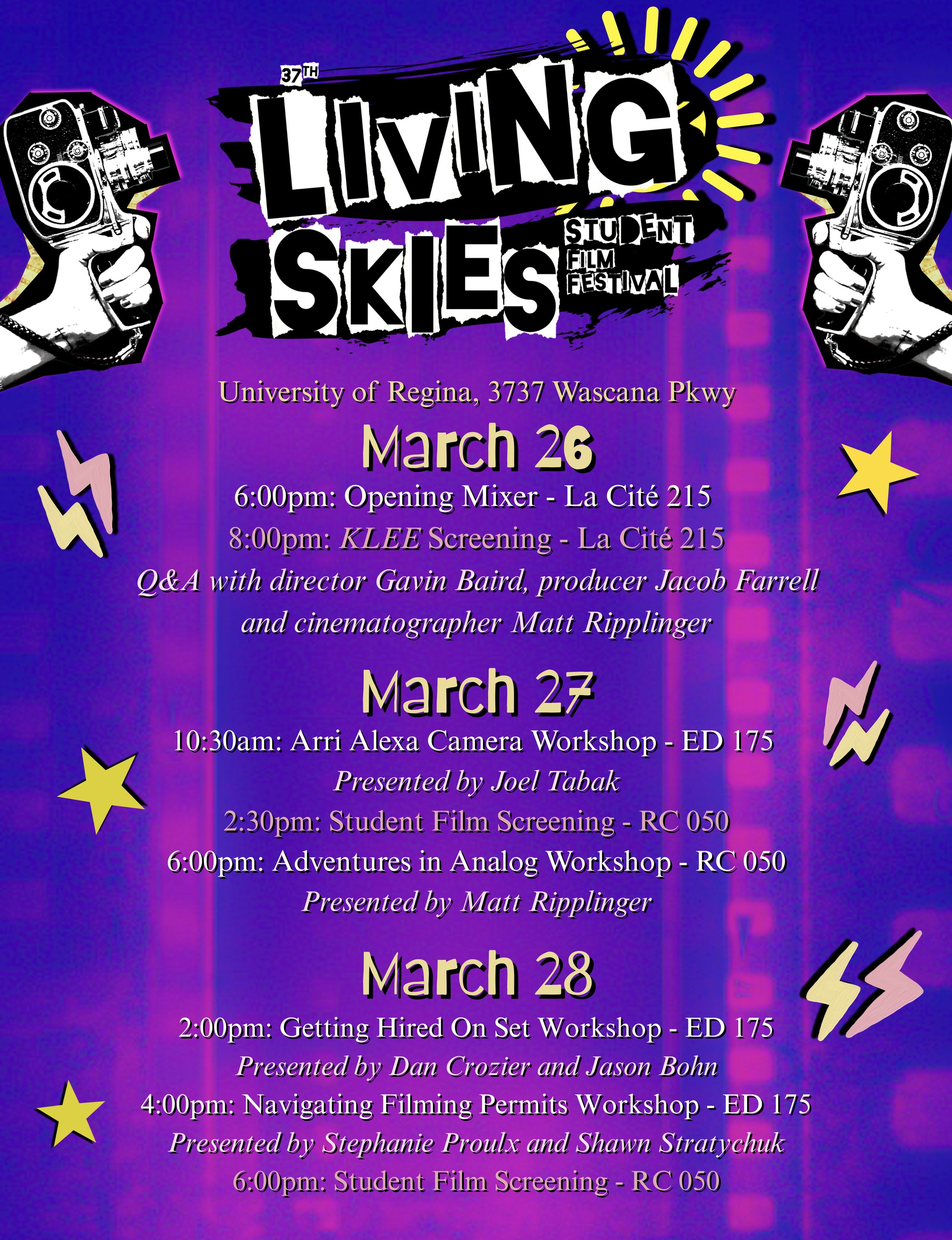The 37th edition of the Living Skies Student Film Festival will occur March 26th-28th, 2026, in Regina, Saskatchewan, Canada.